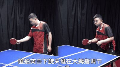 直拍在突击下旋球时,握拍要注意手指调节,关键点在于大拇指。由于直拍握拍时板面相对更垂直,引拍过程中,大拇指要放松,让球拍自然后仰;发力时,大拇指加力,同时中指向前抵,食指扣住球拍,基本不发力。